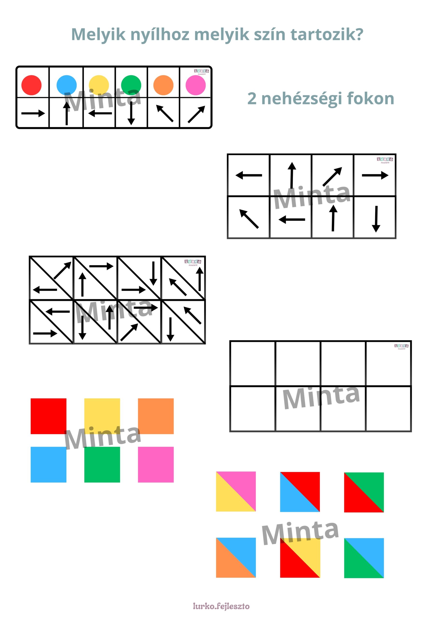 🔹 Kezdő szint: egy irány és egy szín alapján kell elhelyezni a négyzeteket.