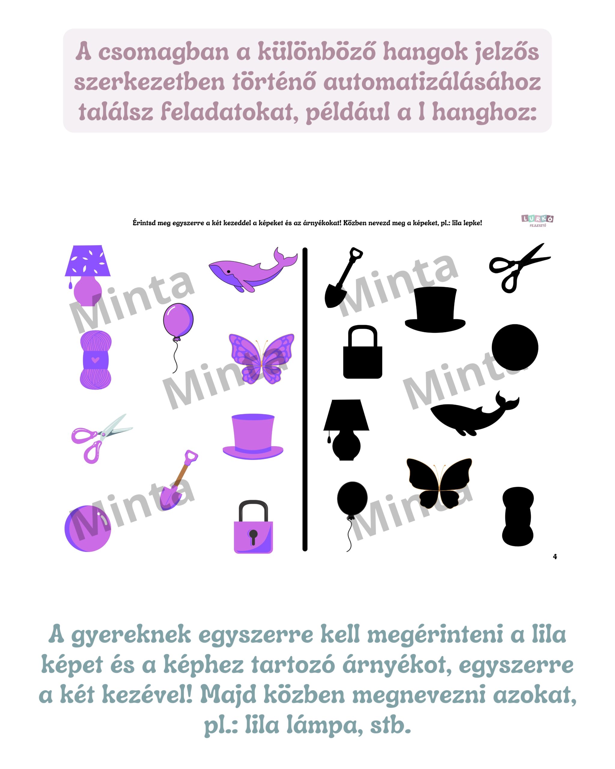 Például az l hang gyakorlásakor a gyermeknek egyszerre kell megérintenie a lila képet és az ahhoz tartozó árnyékot két kézzel, egy időben! Ezután megnevezi a látottakat: „lila lámpa”, „lila labda”, stb.