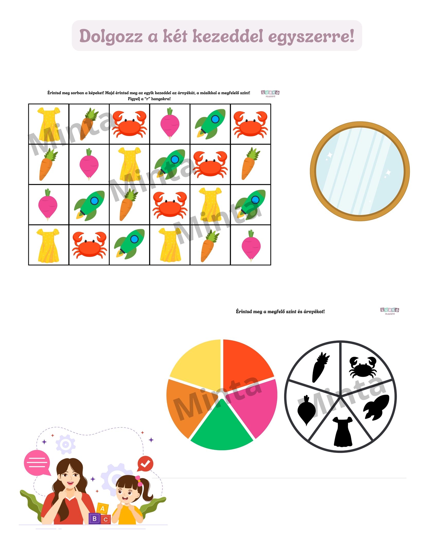 A feladat során a képek sorokba és oszlopokba rendezve jelennek meg. A gyermekek két kézzel, sorban érintik meg a képeket, majd bal kézzel a képhez tartozó színt, jobb kézzel a kép árnyékát választják ki. Így a két kéz egyszerre, összehangoltan dolgozik, miközben a hangok gyakorlása is beépül a feladatba.