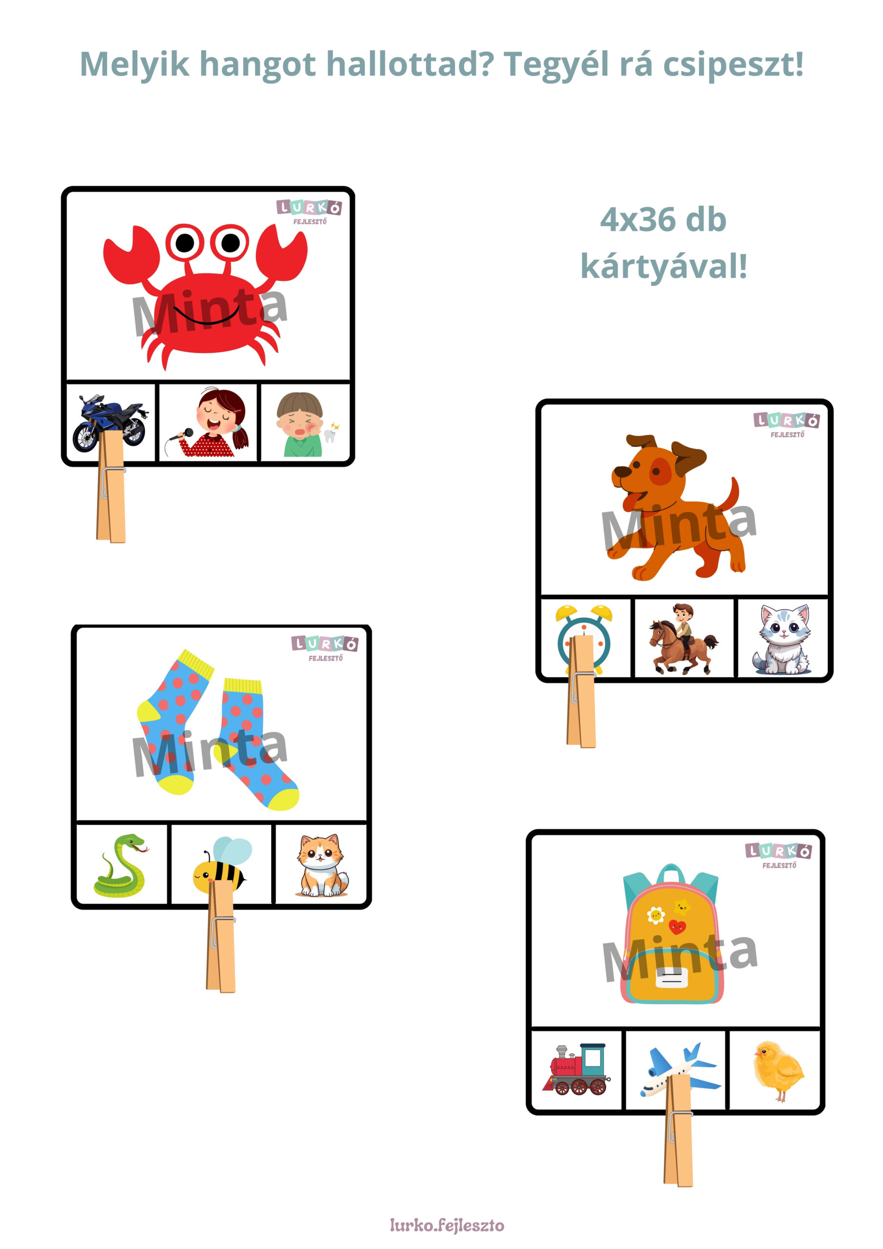 A csomagban 4×36 db kártya található – minden kártyán egy kép és alatta három hang hívóképe látható. A feladat egyszerű, mégis izgalmas: a gyereknek arra a hívóképre kell helyeznie a csipeszt, amelyik hangot hallja a szóban.
