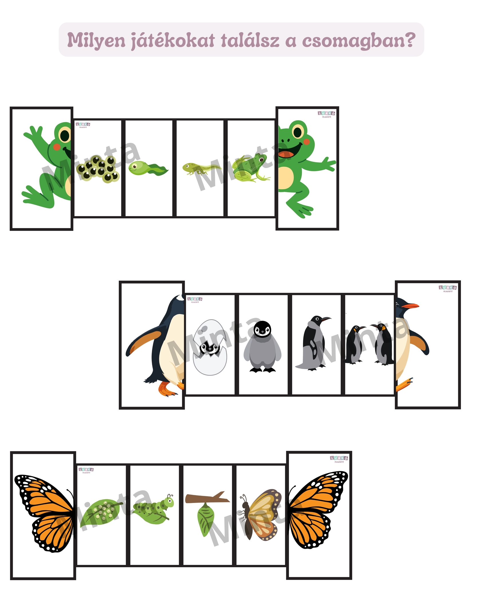 A csomag látványos, könnyen érthető képsorozatokon keresztül szemlélteti, hogyan fejlődnek az élőlények a kezdetektől a kifejlett állapotig. A hajtogatható, lapozható kialakításnak köszönhetően a gyerekek lépésről lépésre követhetik végig az egyes élőlények átalakulását.