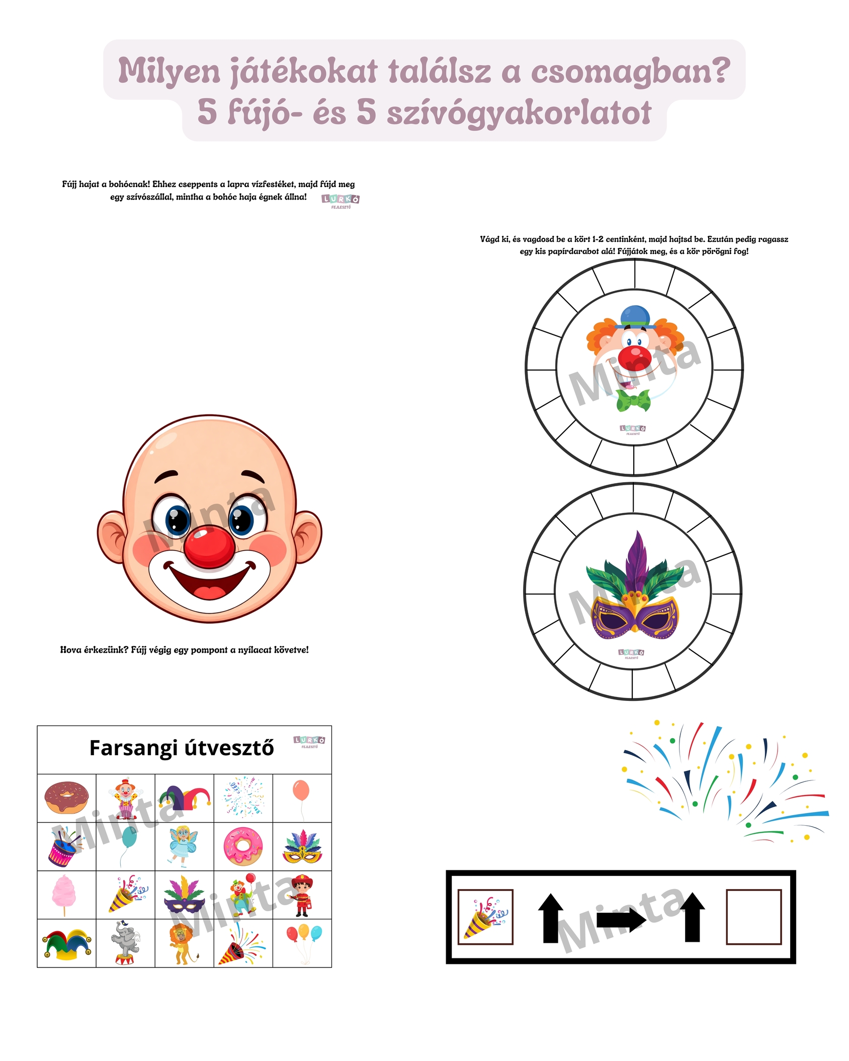 Vidám, farsangi hangulatú fejlesztőcsomag, amely 5 fújó- és 5 szívógyakorlatot tartalmaz, hogy a gyerekek játék közben erősítsék az ajak- és légzőizmaikat. Vásárlás után PDF formában tudod letölteni.