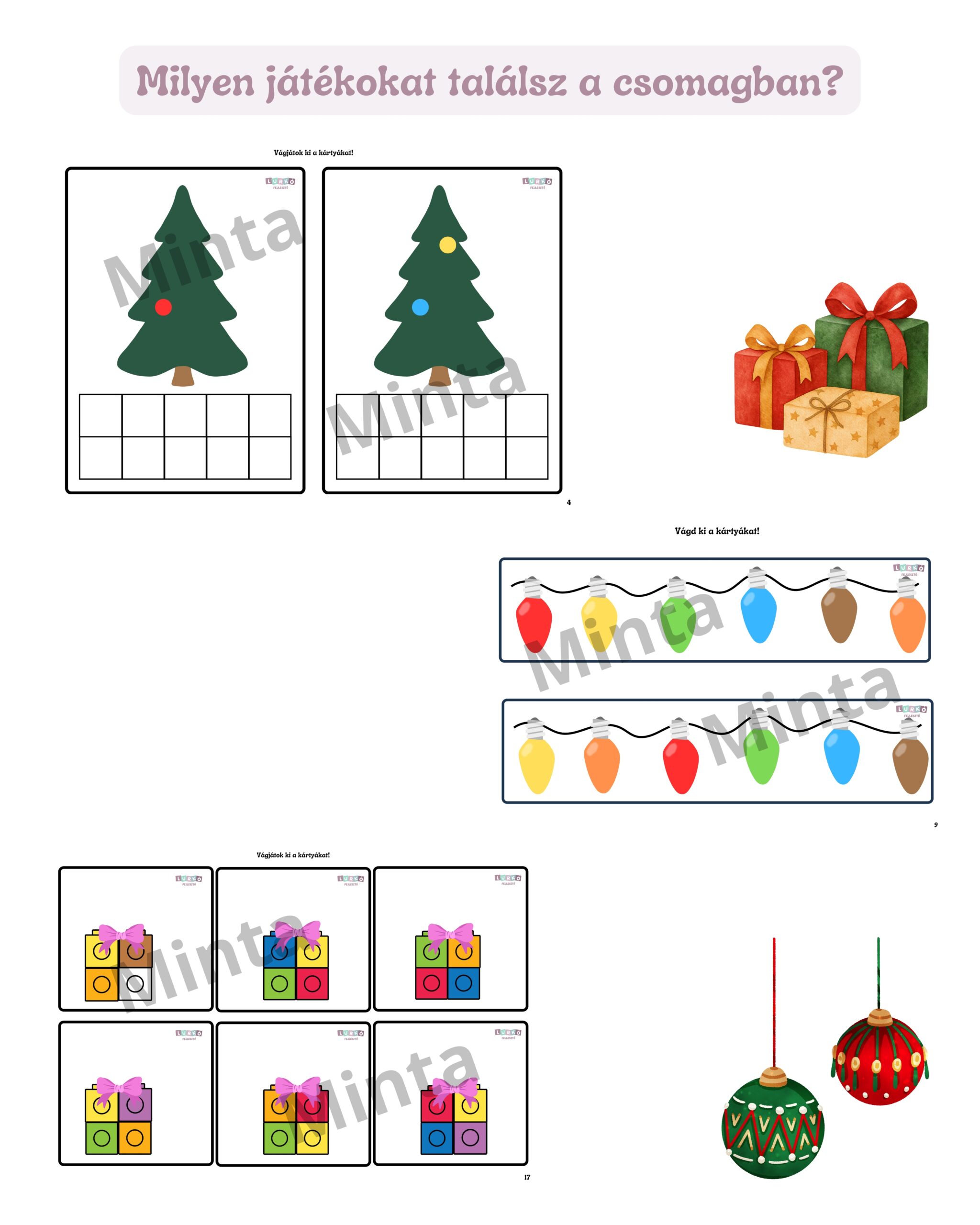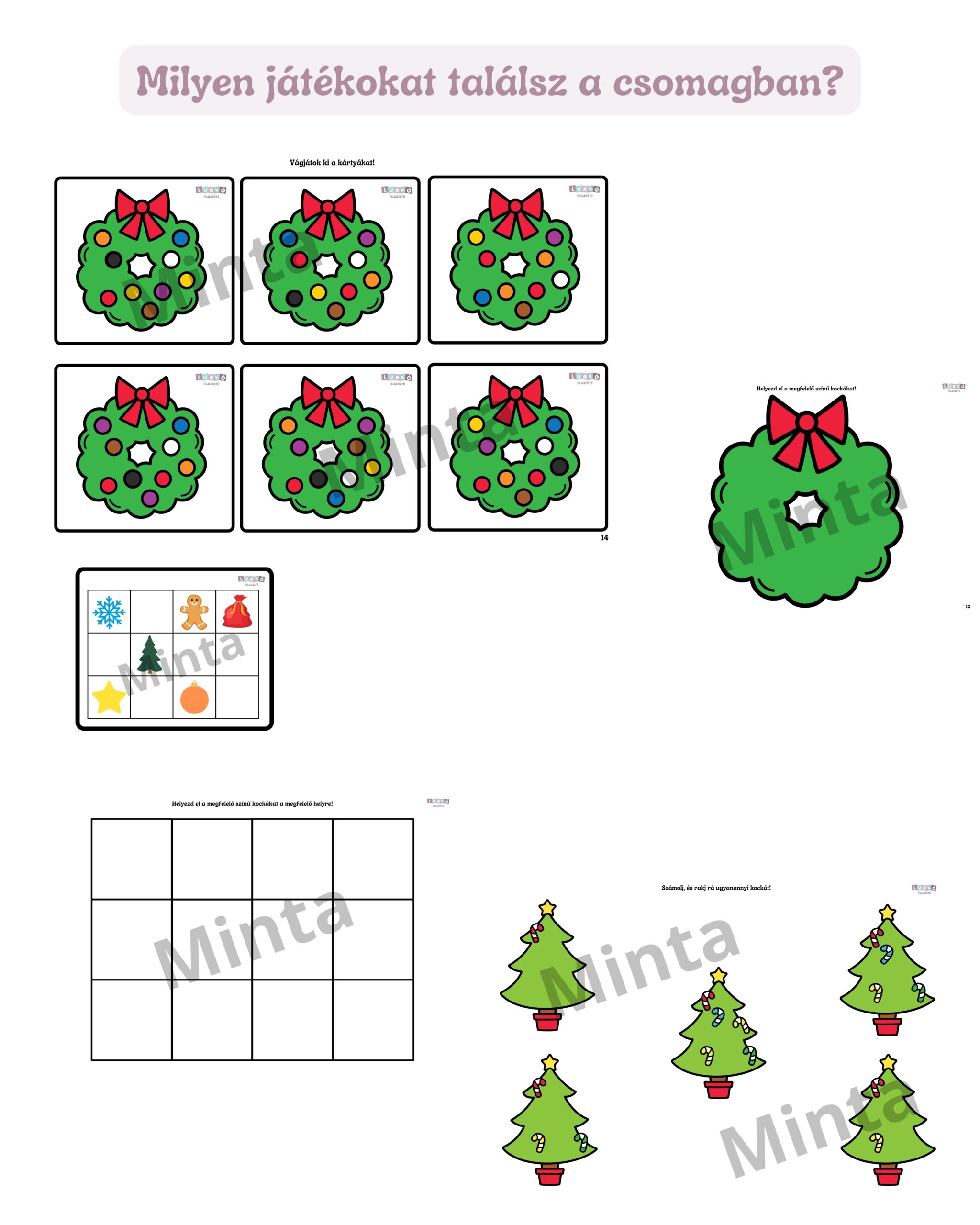 Ez a karácsonyi tematikájú játékcsomag színes kockákkal (legóval is helyettesíthető) játszható feladatokat tartalmaz. A játékok egymástól függetlenül is használhatók, mégis jól felépített, változatos fejlesztési lehetőséget kínálnak.