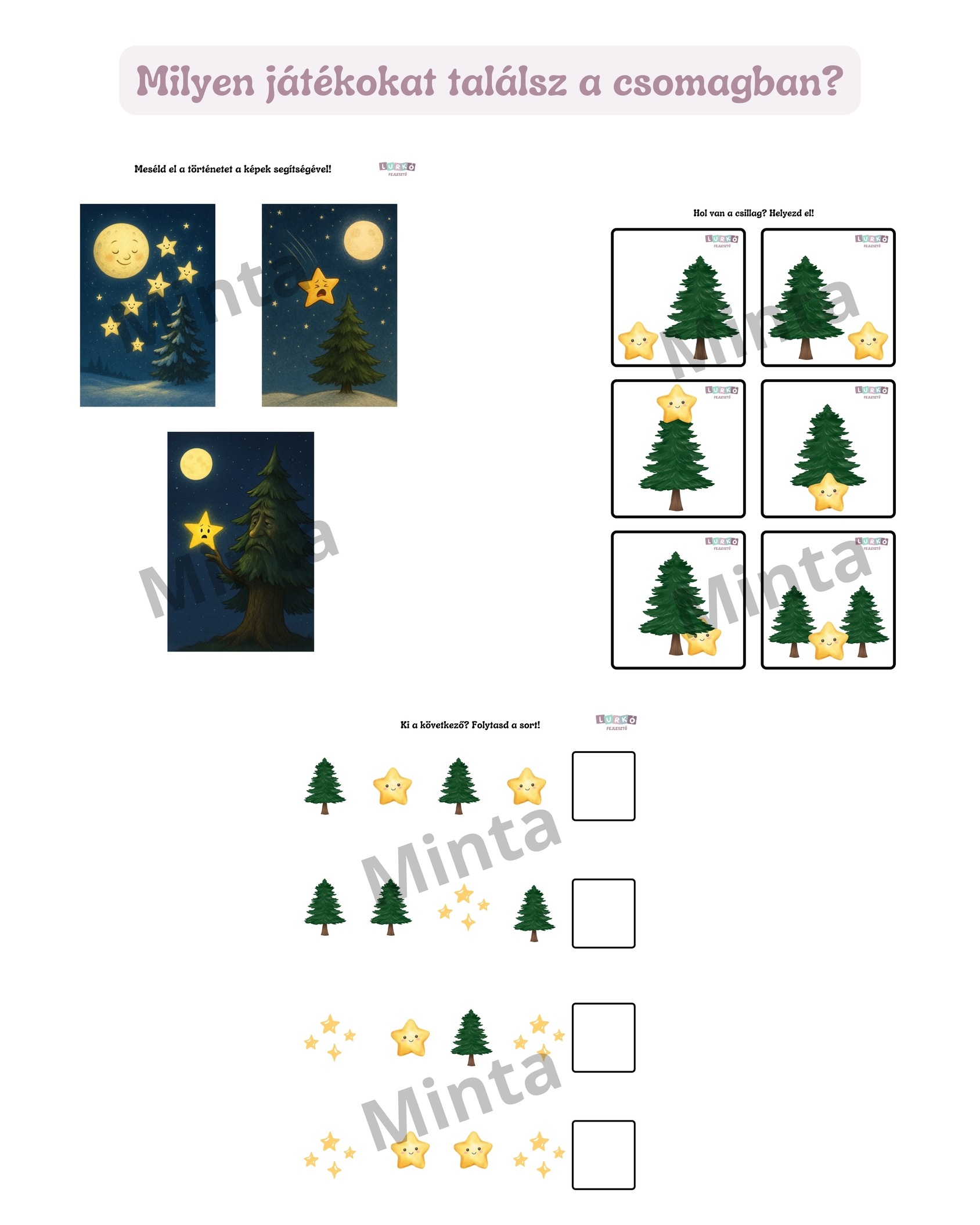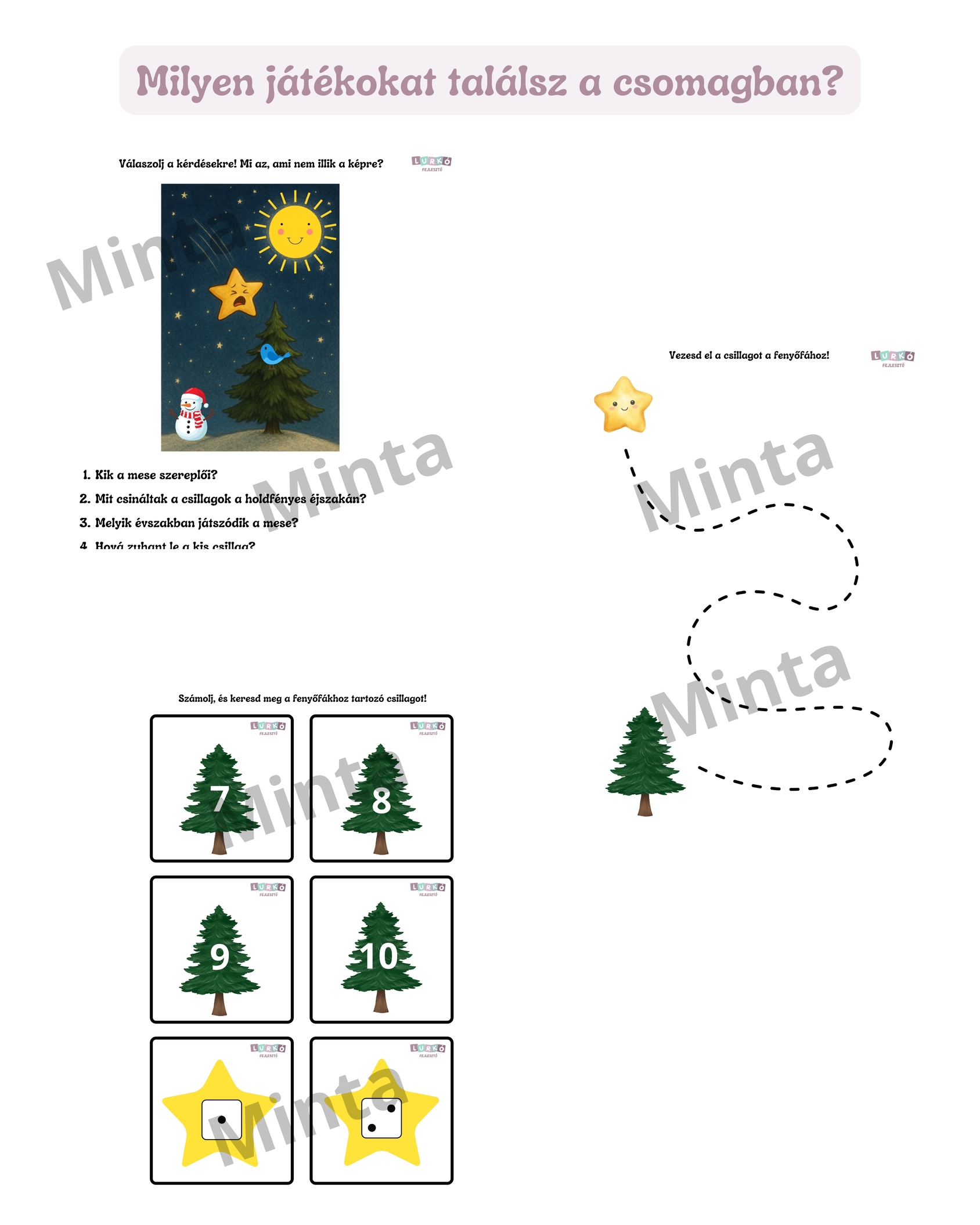 Ez a játékcsomag a „Mióta van csillag a karácsonyfák tetején?” című meséhez kapcsolódó, játékos feldolgozást kínál. A feladatok segítik a mese megértését, az élmények feldolgozását és többféle fejlesztési területet érintenek, miközben végig a történethez kapcsolódnak.