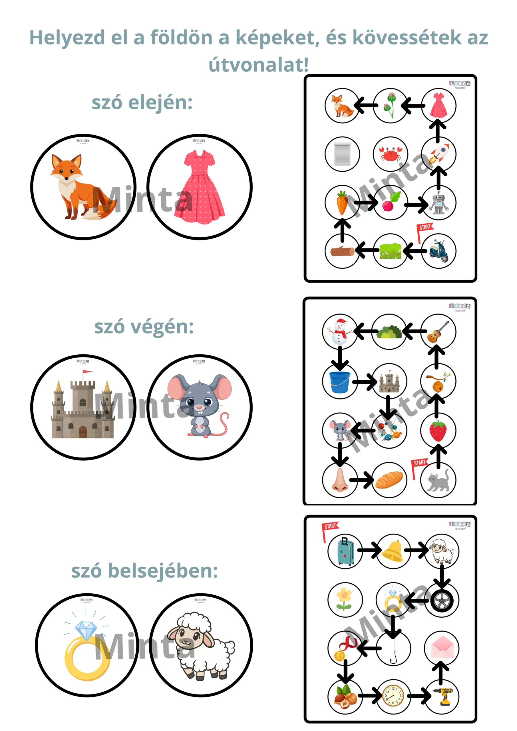 A képeket a földre helyezve a gyerekek az útvonalkártya mintáját követve haladnak – minden egyes megállónál kimondják a képen látható szót, így az R hang gyakorlása mozgással, játékkal és élménnyel kapcsolódik össze.