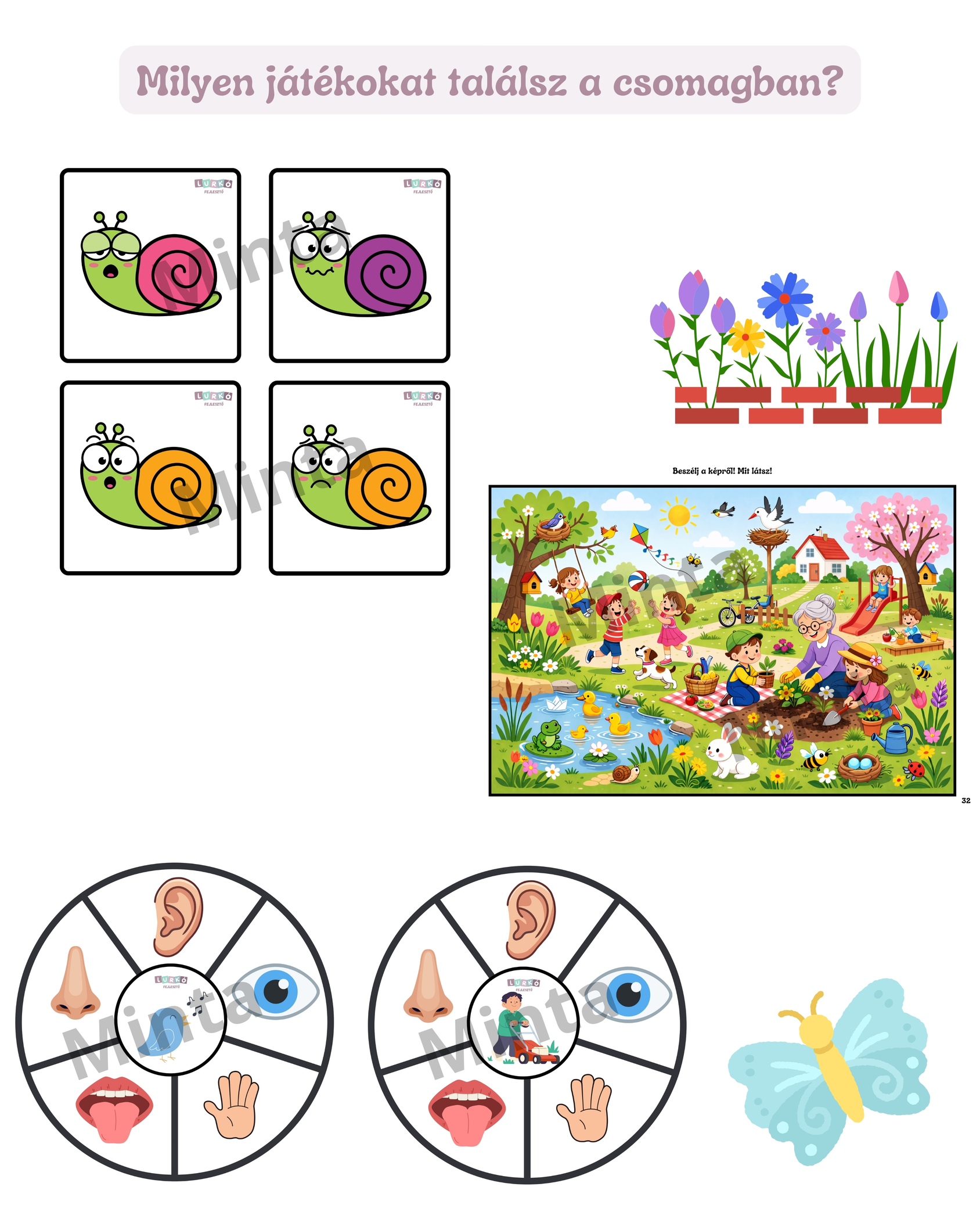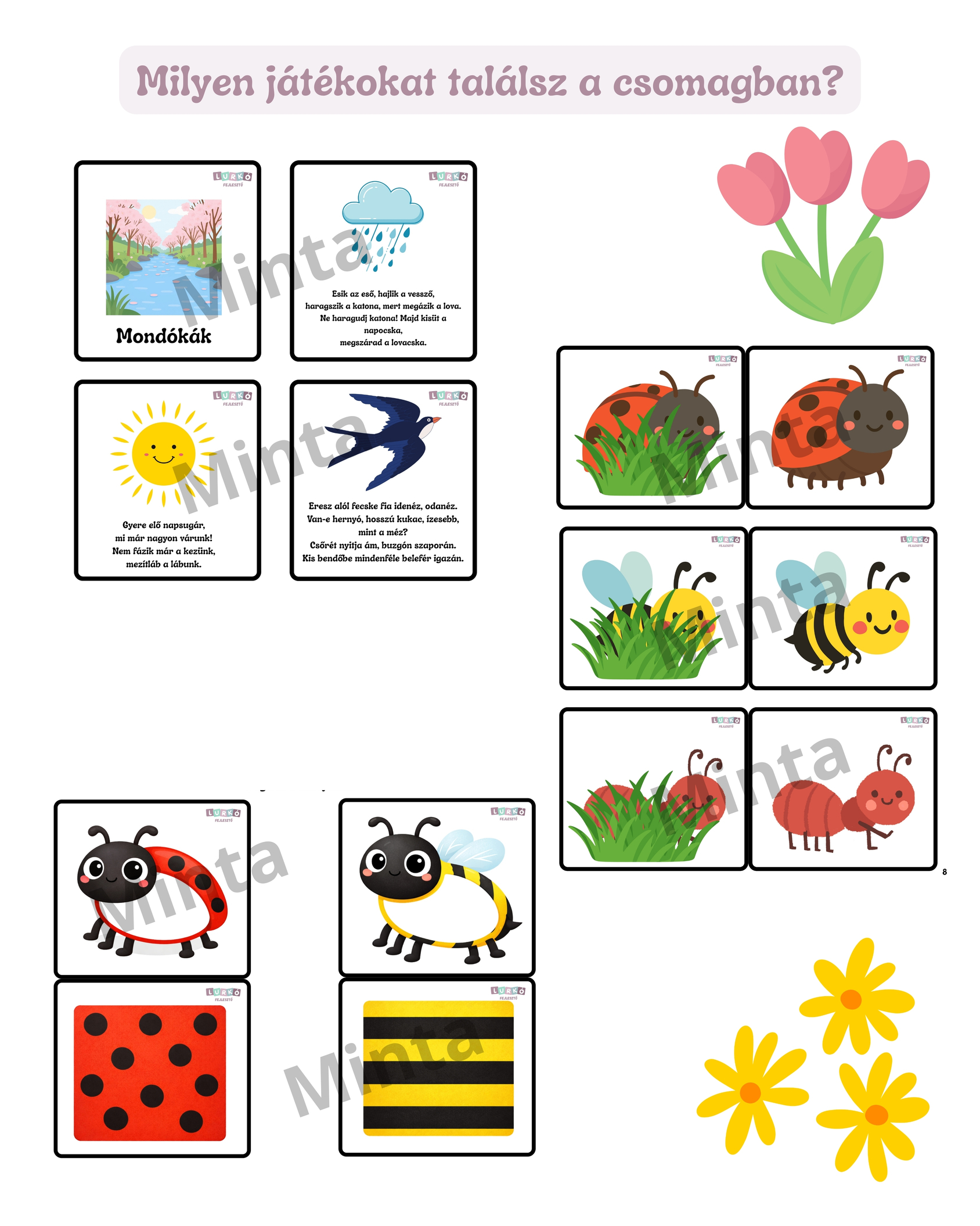 Vidám, színes, életkornak megfelelő feladatokkal készült tavaszi tematikájú fejlesztő csomag, amely kifejezetten a 2–3 éves korosztály igényeihez igazodik.
