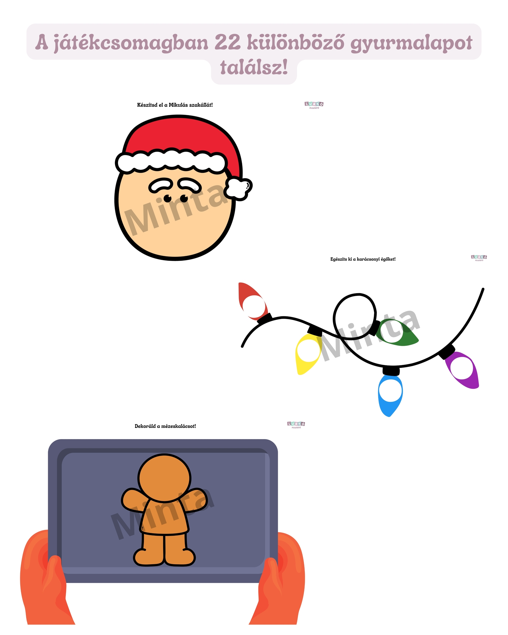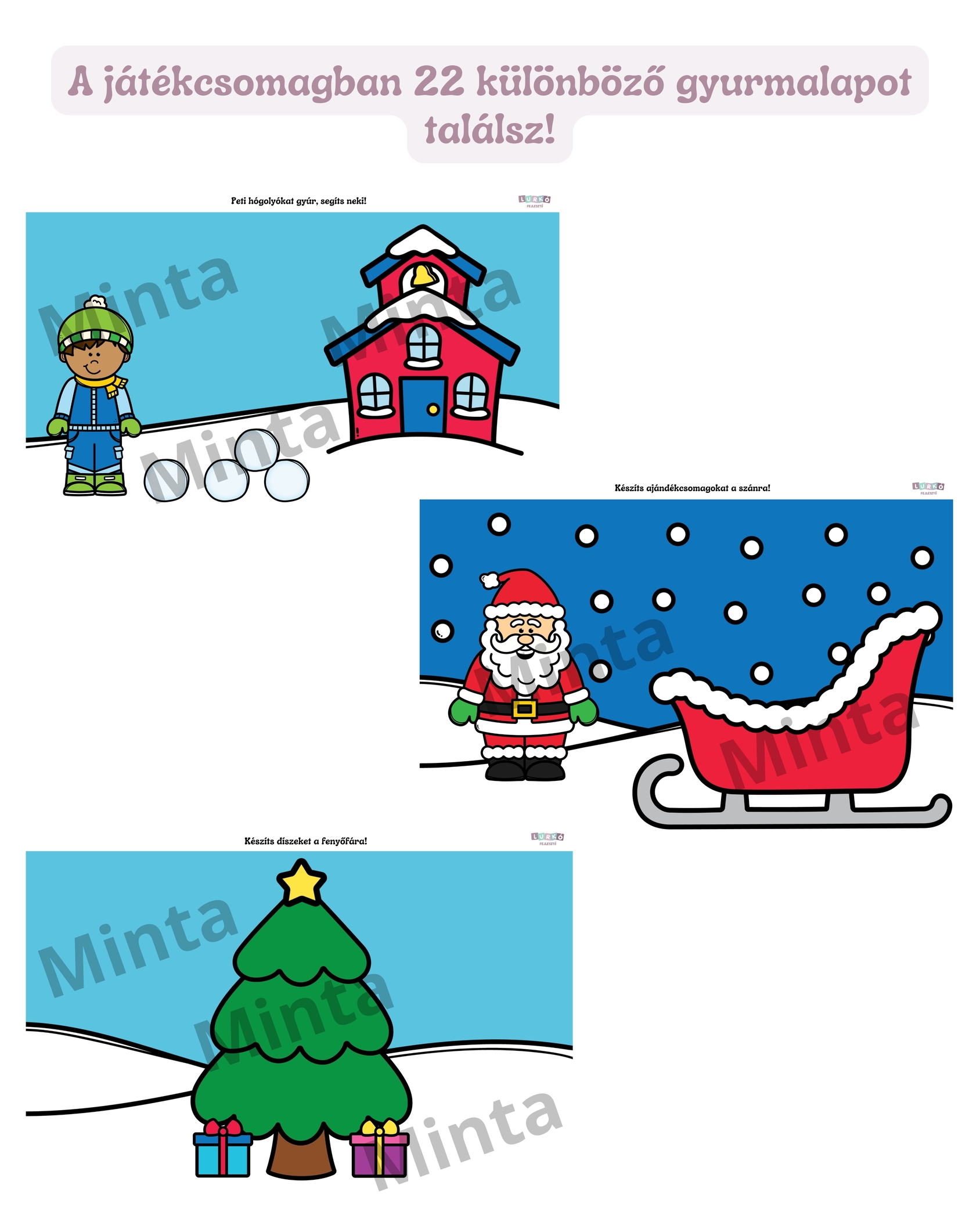 A Téli gyurmalap csomag 22 különböző, izgalmas és vidám feladatlapot tartalmaz, amelyekkel a gyerekek egész télen át kreatívan alkothatnak. A csomagban megtalálhatók karácsonyi témájú lapok – például „Készítsd el a Mikulás szakállát”, „Formázd meg a rénszarvas orrát”, „díszítsd fel a karácsonyfát” – és általános téli lapok is, hogy az ünnepek után is örömmel használhassátok.