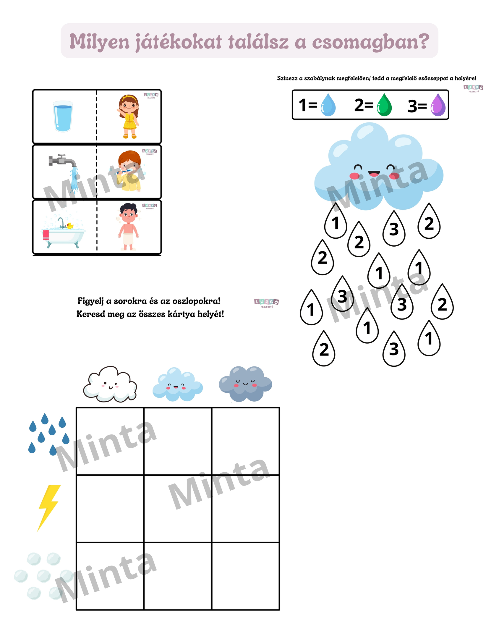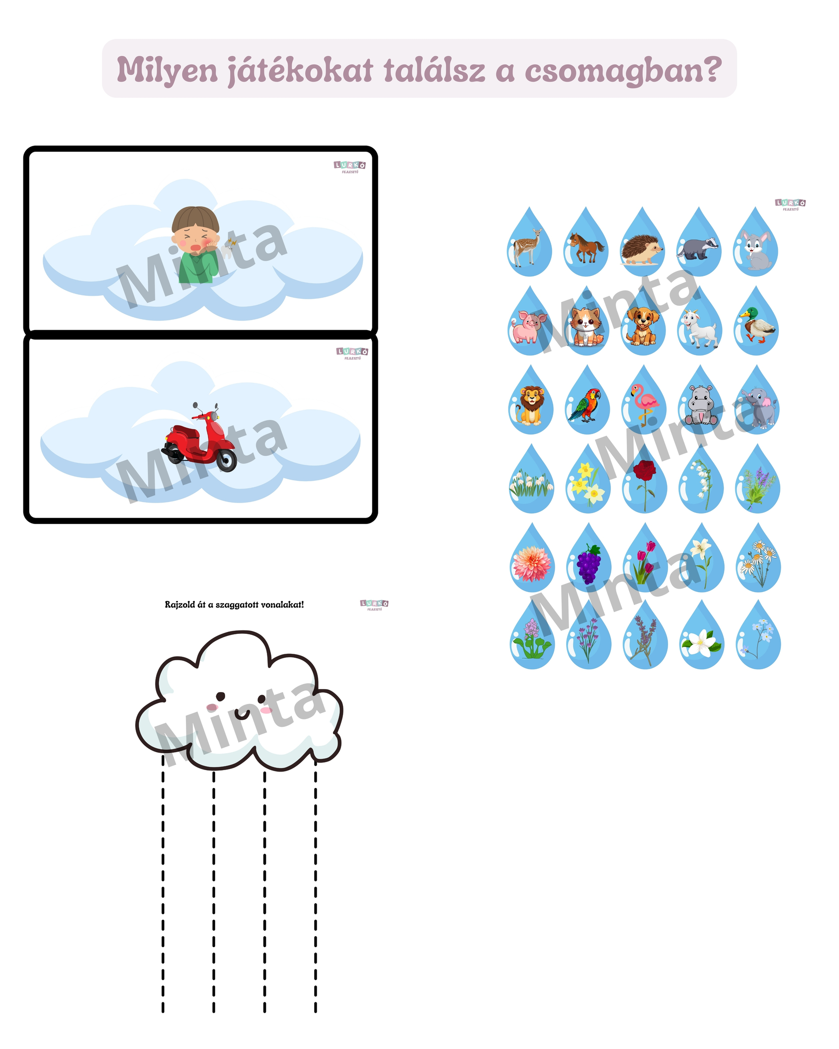 A csomag 11 különböző, változatos feladatot tartalmaz, amelyek a víz körforgását, felhasználását és fontosságát dolgozzák fel mozgásosan, kreatívan és élményszerűen.